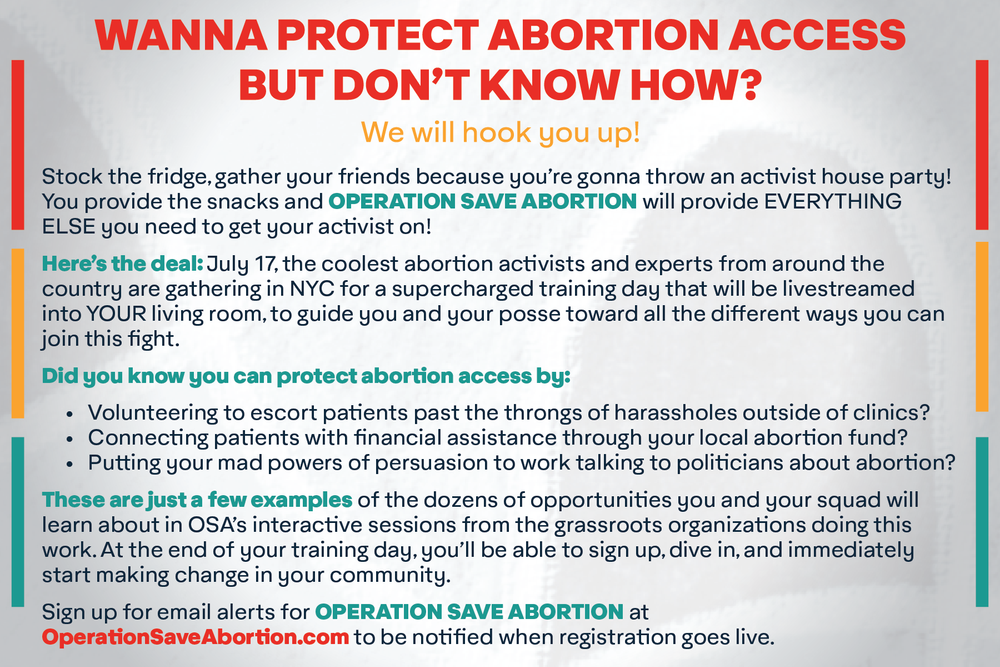 OSA is an activist guide to help volunteers protect abortion, including toolkits and a virtual training session full of panels for learning how to fund abortion, help clinics, take political action, and make good trouble.